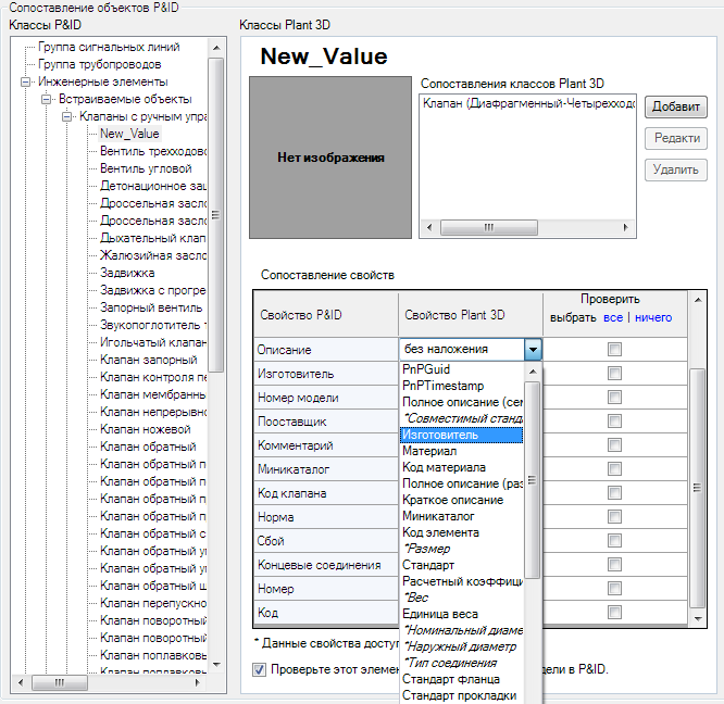 - В области "Сопоставление объектов P&ID" в разделе "Классы P&ID" разверните структуру и щелкните новый объект P&ID (например, New_Valve).