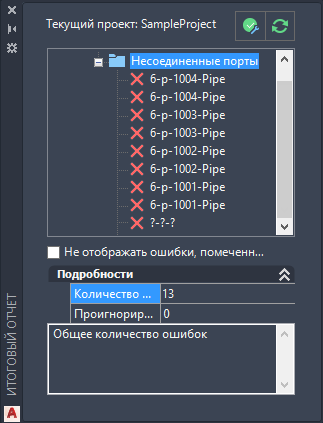 Содержит ошибки, найденные при проверке чертежа, которые можно исправить или пропустить.