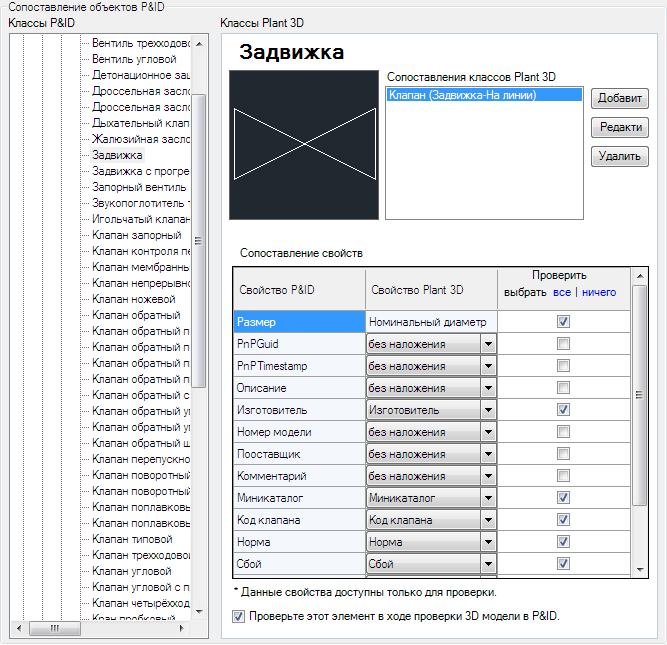 Чтобы включить в процесс проверки проверку сопоставлений свойств для сопоставленного элемента, установите флажок "Проверьте этот элемент в ходе проверки 3D модели в P&ID".