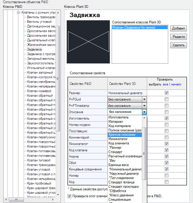 В разделе "Классы P&ID" разверните структуру и щелкните нужный объект P&ID (например, Задвижка).