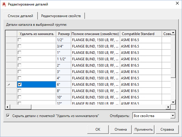 Размеры компонентов, которые не требуется включать в миникаталог, можно удалить. Следует добавить размеры, которые выходили за пределы диапазона в момент копирования компонента из каталога.