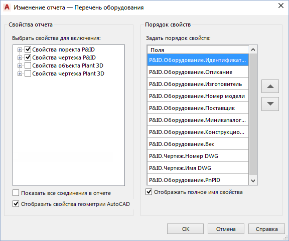 В случае создания шаблона отчета Plant 3D можно указать свойства объекта или чертежа Plant 3D и соответствующим образом их упорядочить. Данные Plant 3D включаются в отчет только при условии, если в проекте существует соответствующий объект P&ID с идентичным идентификатором.