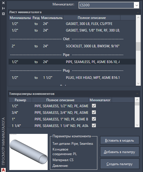 Отображение текущего миникаталога в программе AutoCAD Plant 3D toolset, открытие и просмотр листа миникаталога, вставка детали из этого листа в модель и изменение инструментальных палитр.