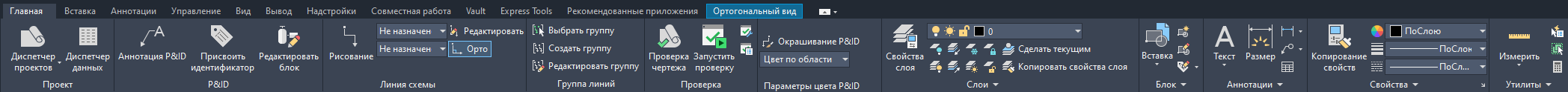 На вкладке "P&ID – главная" отображаются параметры для работы с чертежами P&ID. Данная вкладка содержит следующие панели: