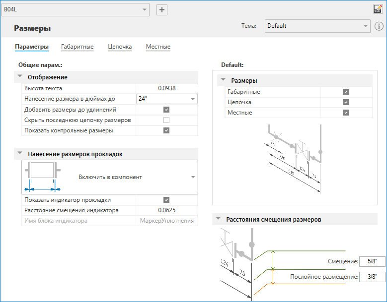 - В разделе «Нанесение размеров прокладок» укажите, требуется ли указывать размеры прокладок отдельно или же включить их в размеры компонентов. Если размер прокладки включен в компонент, можно указать, следует ли отображать индикатор прокладки, и задать смещение.
