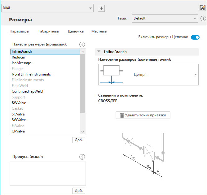 - В списке "Тема ISO" выберите тему ISO ("Трубопровод по умолчанию" или "Трубопровод небольшого диаметра"), для которого требуется применить настройки типа размеров.
