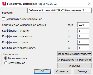 Параметры сейсмического расчета конструкции зависят от выбора сейсмических норм, по которым производится расчет влияния сейсмических нагрузок на конструкцию. После выбора Испанских сейсмических норм NCSR-02 в диалоговом окне Новый вариант или нажатия на кнопку Параметры в диалоговом окне Тип расчета (вариант сейсмического расчета, определенный по данным нормам, должен быть выделен) на экране появляется следующее диалоговое окно.