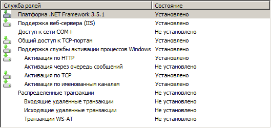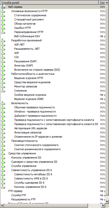 - Прокрутите список до пункта "Службы ролей" и убедитесь в том, что перечисленные ниже службы ролей установлены: