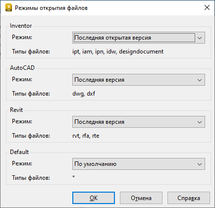 - Можно указать, в какой версии приложения САПР будут открываться файлы Inventor, AutoCAD и Revit — последней, последней запущенной или той, в которой файл был сохранен.