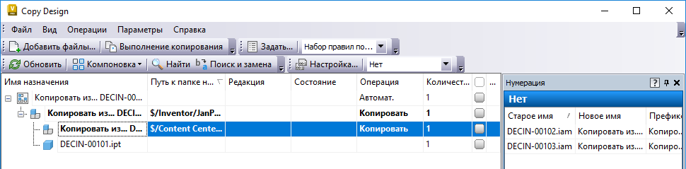 Используйте этот вид для доступа к чертежам и назначения отдельных операций копирования. Связанная операция имеет статус Автомат. в столбце «Операция».