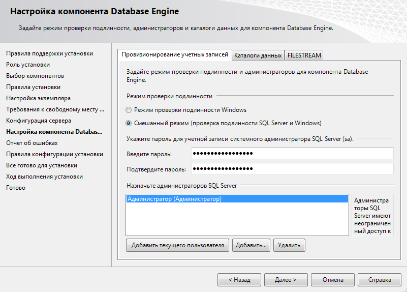 Учетная запись и пароль администратора SQL Server, настраиваемые по умолчанию