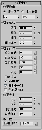 - 在视口中拖动以创建发射器时,即隐性设置了这两个参数的初始值。可以在卷展栏中调整这些值。