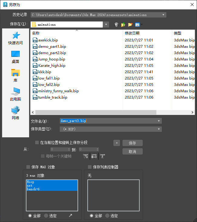 当保存 FIG 文件时(在体形模式),“另存为”对话框是一个标准的 Windows“保存文件”对话框。然而,当保存 BIP 或 STP 文件时,可以将对象和动画控制与该文件一起保存。