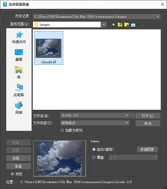 “选择背景图像”对话框可用于选择视口背景的文件或文件序列。