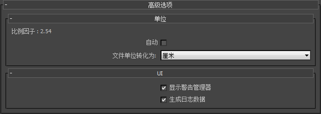 如果希望 3ds Max FBX plug-in自动识别、设置并转化传入文件的单位以与主机应用程序的单位匹配,请激活“自动”选项。