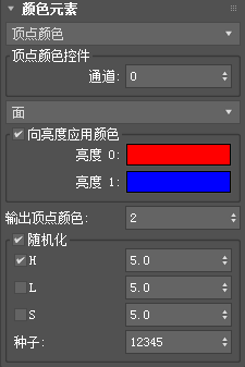 基于堆栈信息、贴图、软选择或顶点颜色给对象的元素上色。可以根据色调、亮度和饱和度随机化数据通道输出。