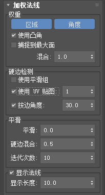 “加权法线”通过改变顶点法线使其与较大平面多边形垂直,改进模型的明暗处理。当与分段为零的切角修改器和一起使用时,明暗处理将在切角面(而不是整个模型)中混合。