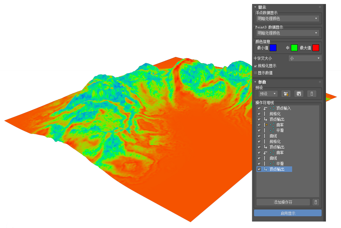 用于使用曲率数据隔离特定地形特征的数据通道修改器的示例。此进程堆栈可用于屏蔽区域,如用来创建逼真的积雪效果,在进一步建模之后将自动更新。