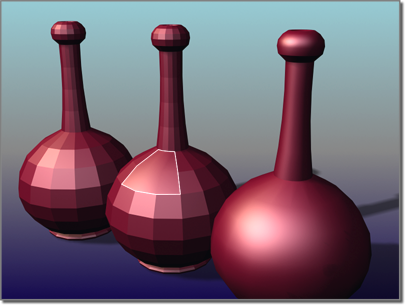 右:请使用下面三种不同的平滑组对瓶子执行平滑操作:瓶身、瓶颈和顶边。