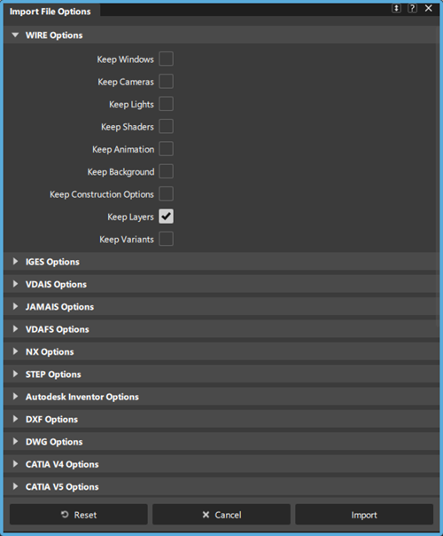 要用文件内容替换当前场景,请使用“File”>“Open”。还支持 PTC Granite 格式,但由于没有相关选项,未在选项窗口中将其列出。