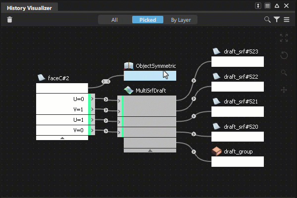 默认情况下,“History Visualizer”显示文件中所有对象的构建历史的图表视图。只有具有构建历史的对象才会显示在图表中。