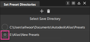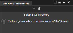 预设将在指定预设目录中保存为 .hprest 文件。默认情况下,指定的目录位于以下位置:C:\Users\username\Autodesk\Alias\Presets