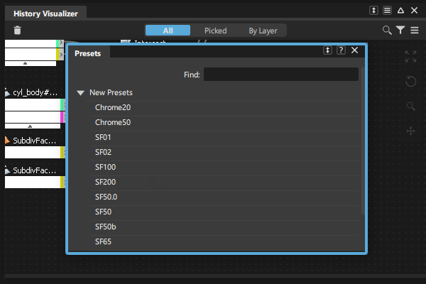 可以从具有活动构建历史的工具节点创建历史预设。工具节点当前必须位于“History Visualizer”图中,才能成为历史预设的源。从活动工具节点创建历史预设后,该预设与其源工具节点无关。
