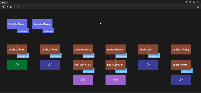 通过显示或隐藏 SBD 窗口,您可以查看场景中对象和组的内部结构。SBD 窗口与视图窗口相似,但它不提供场景的可视化表示,而是在计算机中显示场景的内部结构图形。