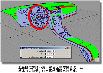 分析模型的安全性。此工具特别适合汽车内部曲面设计工作,可以避免在发生交通事故时司机的头部撞到尖锐的内部曲面。