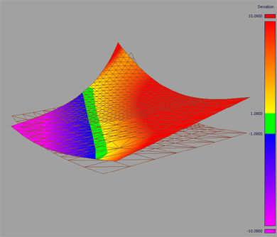 在颜色渐变上显示的曲面和网格之间的最大距离。偏差大于此值的曲面区域将以纯色(红色或紫色)显示。默认值为 10.0。