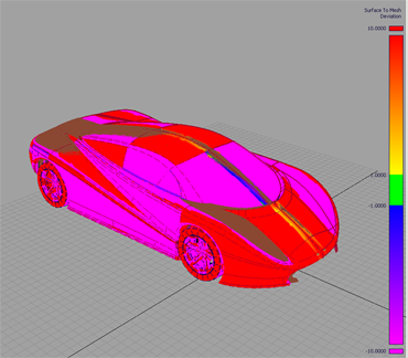 将一组网格与一组 NURBS 曲面之间的偏差(距离)显示为曲面上的彩色错误贴图。您还显示两组曲面或两组网格之间的偏差。