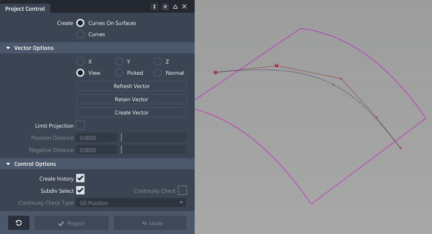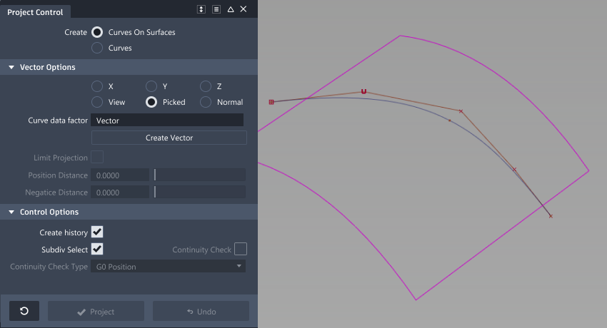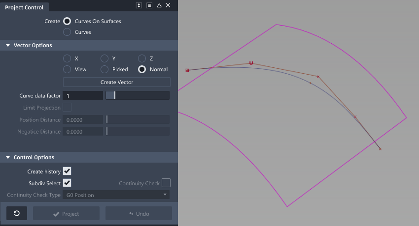 将曲线投影到细分对象的曲面上时启用此选项。启用后,“Project”工具对细分对象的行为方式与对 NURBS 曲面的行为方式相同。