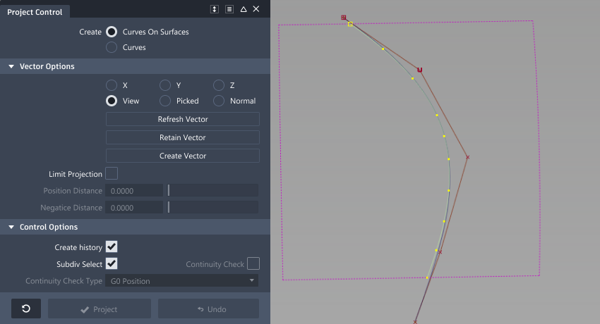 使用此选项可限制曲线沿指定投影向量的投影距离(“Vector Options”),以便曲线不会自动穿过目标对象进行投影。