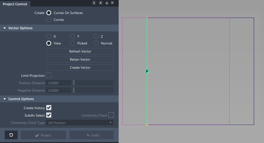 向量的名称将显示在“Picked Vector”字段中。面上线将根据拾取的投影向量进行更新。
