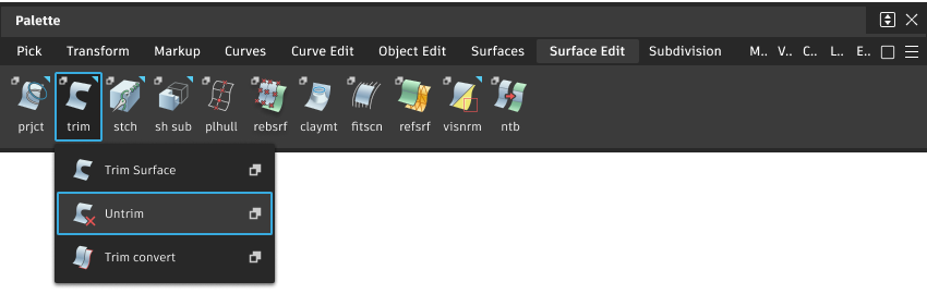 “Untrim”工具可以一次撤消对曲面执行的一个修剪,也可以撤消对曲面的所有修剪。
