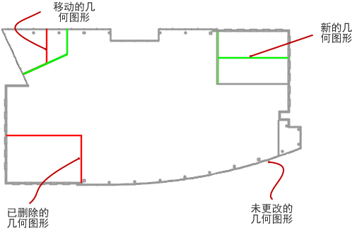 您可以从视觉上比较图形或图形版本之间的几何图形更改。预先指定的颜色集可以区分新添加、已删除、已编辑(例如,移动或调整大小)或未更改的对象。图形版本之间的视觉比较结果将显示在新图形中,而两个图形之间的比较结果将显示在当前图形中。