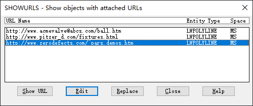 输入 SHOWURLS 以显示 Showurls 对话框。您可以单击单个 URL 以显示它,也可以单击一个或多个 URL 来编辑或替换它们。