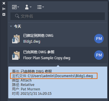 “活动见解”事件中还包含何时将图形作为外部参照附着到其他图形。参照当前图形的图形名称会显示在事件详细信息中。