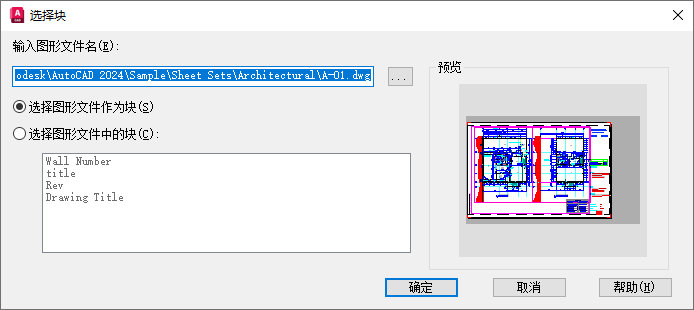 使用指定的整个图形文件或图形样板文件作为块定义。