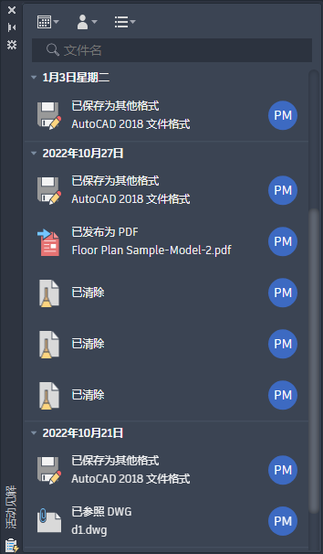 对图形所做的每个更改并非都会记录为特定事件。例如,在保存图形后,绘制直线或圆等常规图形编辑操作会记录为“已编辑”事件,而打印和发布会记录为“已发布”事件。