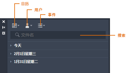 - 搜索功能会按路径和文件名过滤与当前图形文件关联的事件。搜索功能可以单独使用,也可以与日历、用户和事件过滤器结合使用。