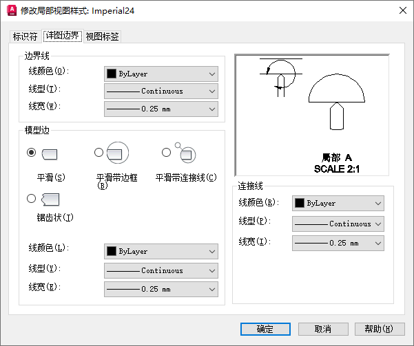 设置局部视图的详图边界线、模型边和连接线的特性。