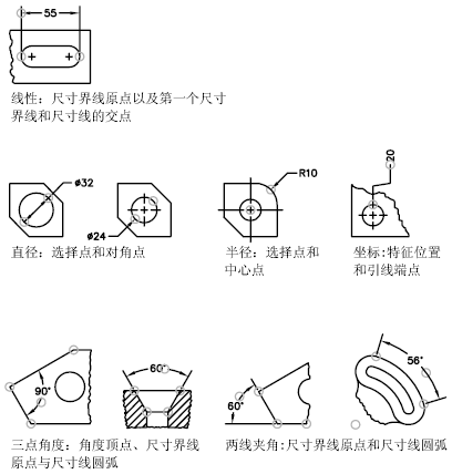每种类型标注的定义点如下图所示。标注文字的中间点是所有标注类型的定义点。