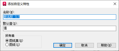 SHEETSET(命令) 查找:“打开图纸集” > 在顶部节点上单击鼠标右键 > “特性” > “编辑自定义特性” > “添加”