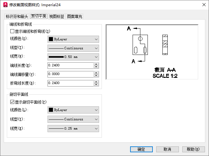 设置剖切线使用的端线、折弯线和平面线段的特性。