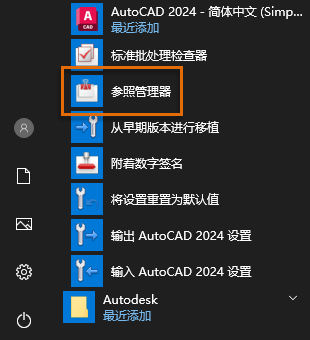 可以从 Windows“开始”菜单启动“参照管理器”,方法是依次单击“Autodesk”>“AutoCAD 版本”>“参照管理器”。