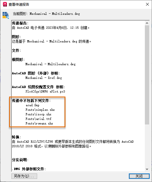 在此样例中,将打开样例图形、查看图形所参照的文件,并使用默认设置创建该图形的传递包。