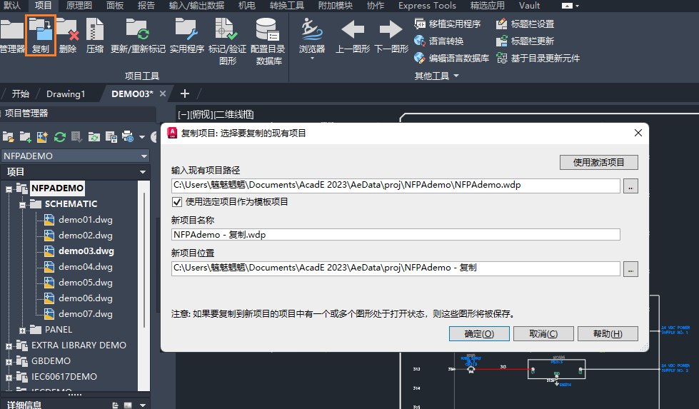 - 在“复制项目: 输入项目图形的基本路径”对话框中,指定要复制的项目相关文件。