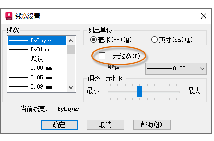 要控制线宽的显示,请单击线宽列表底部的“线宽设置”按钮。在“线宽设置”对话框中,可以选择是否要显示线宽。