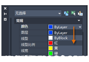 “特性”选项板显示所有重要特性设置的列表。可以单击任何可用字段来更改当前设置。在下面的示例中,如果未选择对象,则当前颜色将从“ByLayer”更改为“红色”。然后将为所有随后创建的对象指定颜色特性“红色”。